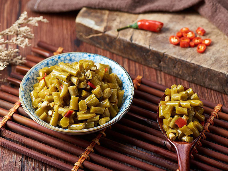 2、泡菜坛洗净晾干把凉的花椒盐水和豆角放进坛子,水要没过豆角,但不要加满,尽量占3/4坛子空间,然后加点高度白酒,喜欢吃辣的放点干辣椒,随后酱菜厂家用干净的水密封坛口,放置阴凉通风处4--5天,即可食用。